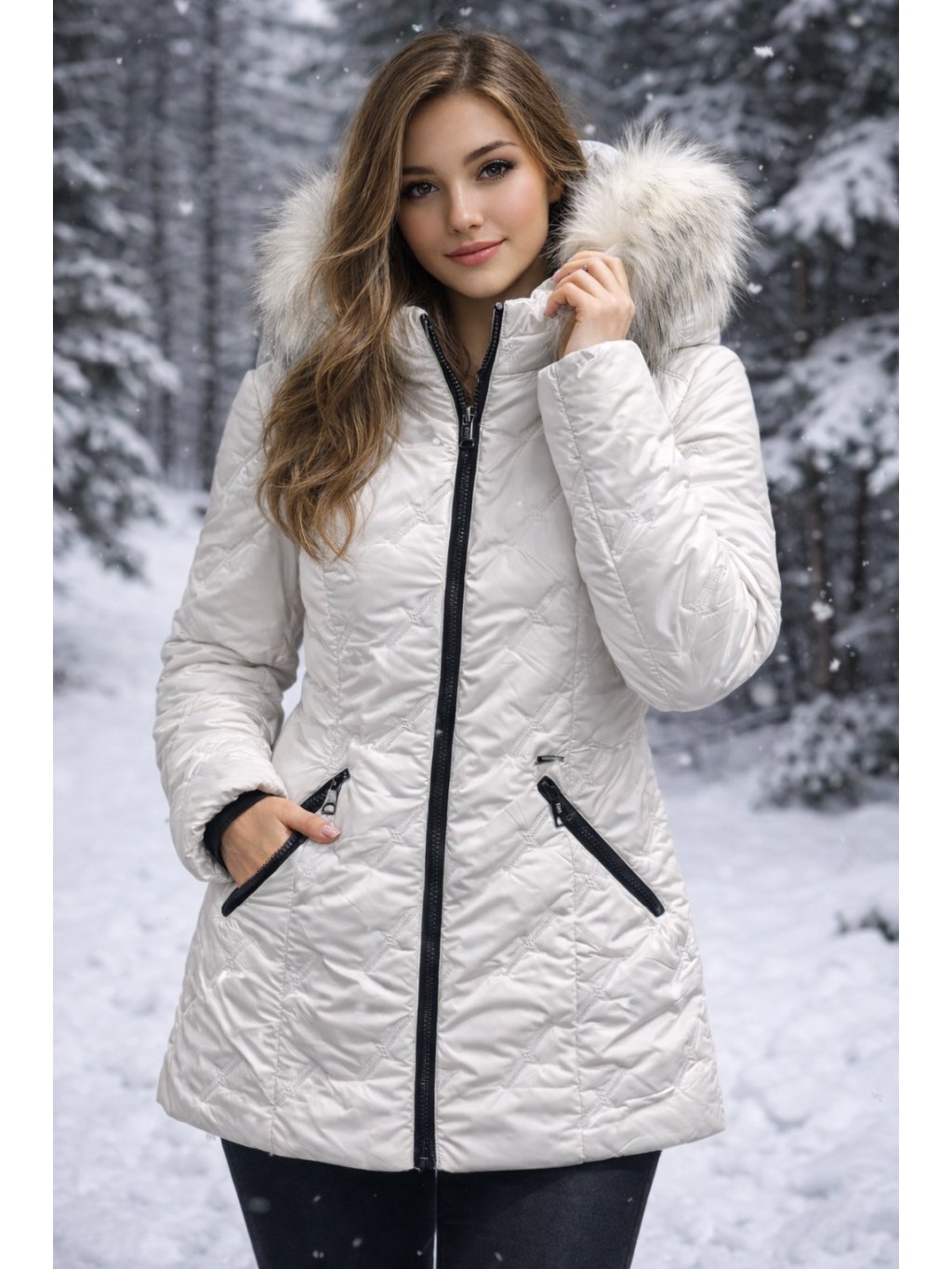 Bílá zimní dámská bunda od firmy HE - Ó s hřejivou vložkou Isosoft je přesně ten typ kousku, který vypadá skvěle a zároveň umí být praktický. Prošívaný střih krásně sedí na postavě, delší délka kryje záda a kožíškový lem kapuce dodá bundě elegantní, „zimní“ výraz i extra pocit tepla.