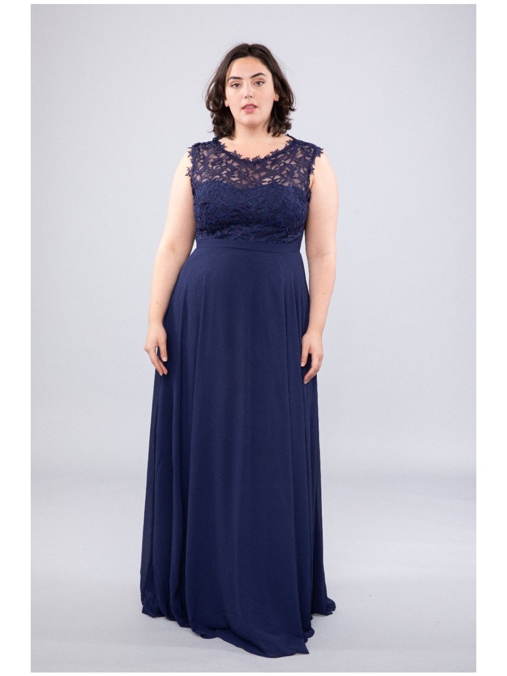 Elegantní dlouhé šaty v nadčasové námořnické modré, které podtrhnou ženské křivky a dodají postavě lehkost i noblesu. Horní díl je zdobený jemnou květinovou krajkou, která působí slavnostně a zároveň velmi vkusně. Hladká, splývavá sukně z lehkého materiálu krásně padá a zajišťuje pohodlí po celý večer.