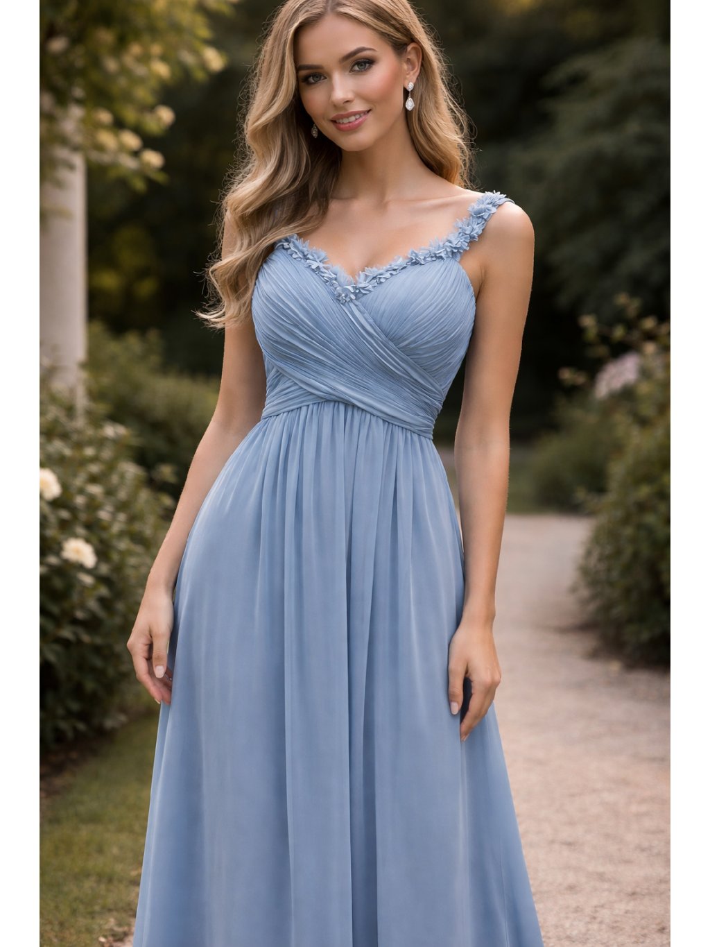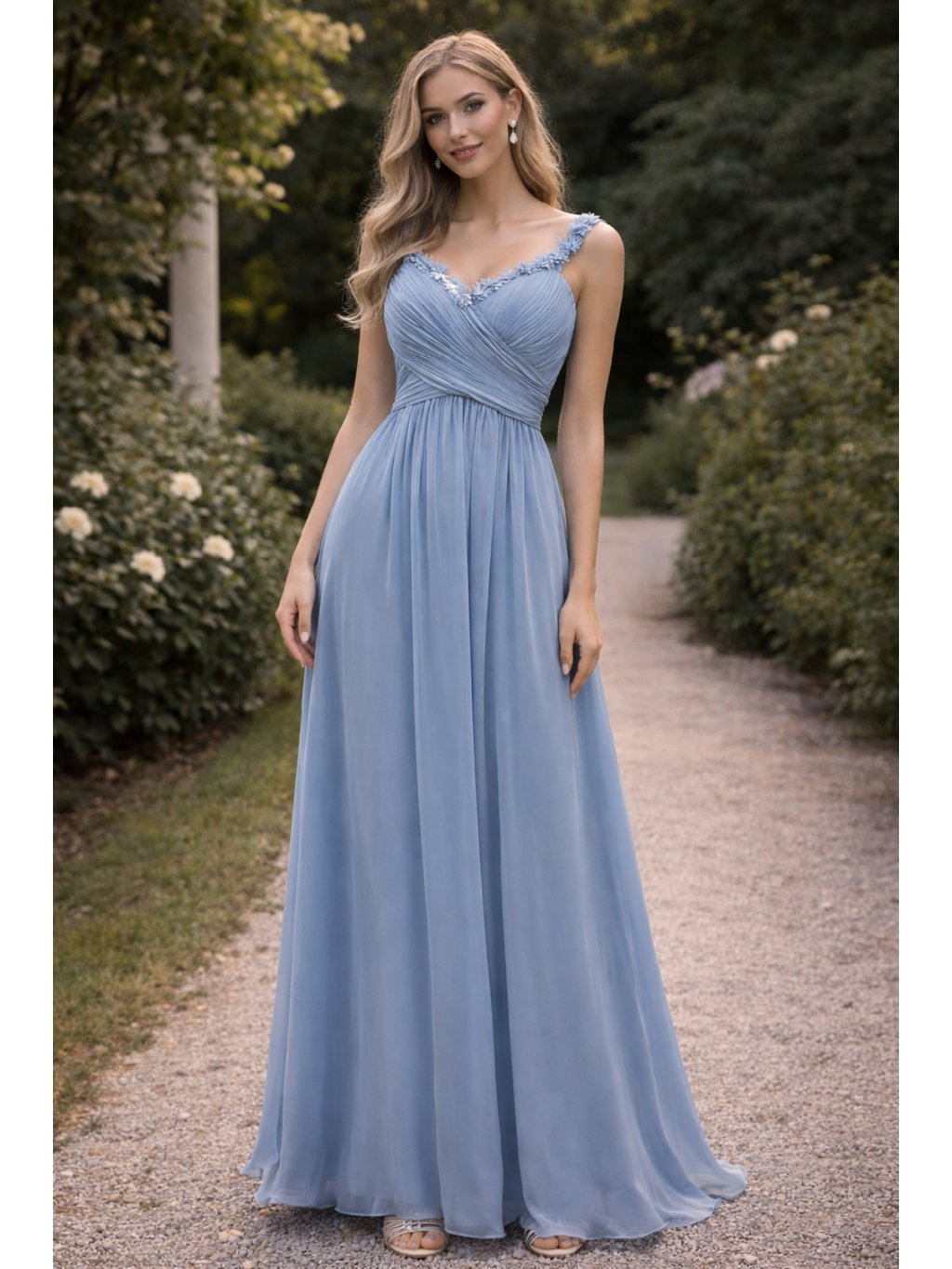 Elegantní dlouhé šaty v jemném modrém tónu zaujmou na první pohled svou lehkostí a nadčasovou siluetou. Živůtek je propracovaný do jemného řasení, které se kříží přes dekolt a krásně tvaruje postavu. V-výstřih působí velmi žensky, aniž by byl příliš výrazný.