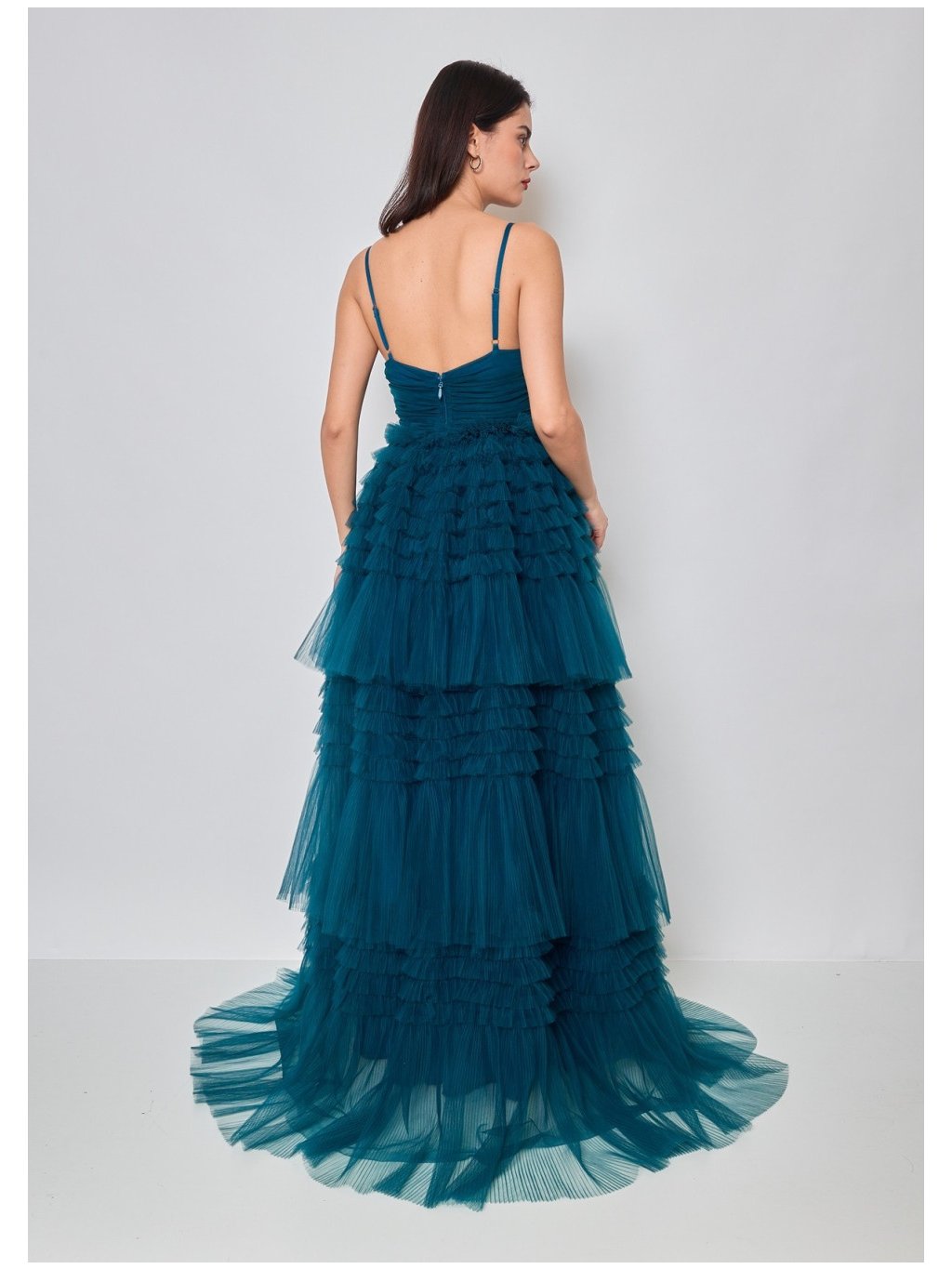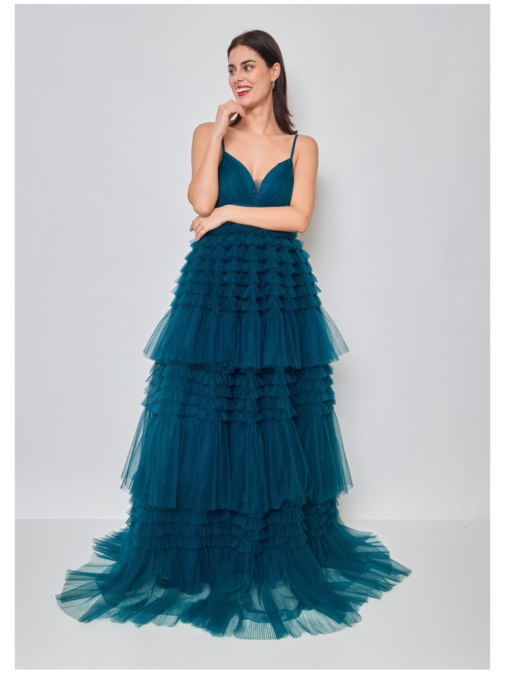 Nepřehlédnutelné dlouhé šaty v sofistikované petrolejové modré barvě, které zaujmou na první pohled bohatou tylovou sukní s vrstvenými volány. Tento model je ideální volbou pro ženy, které chtějí na společenské události zazářit a zároveň působit elegantně a moderně.