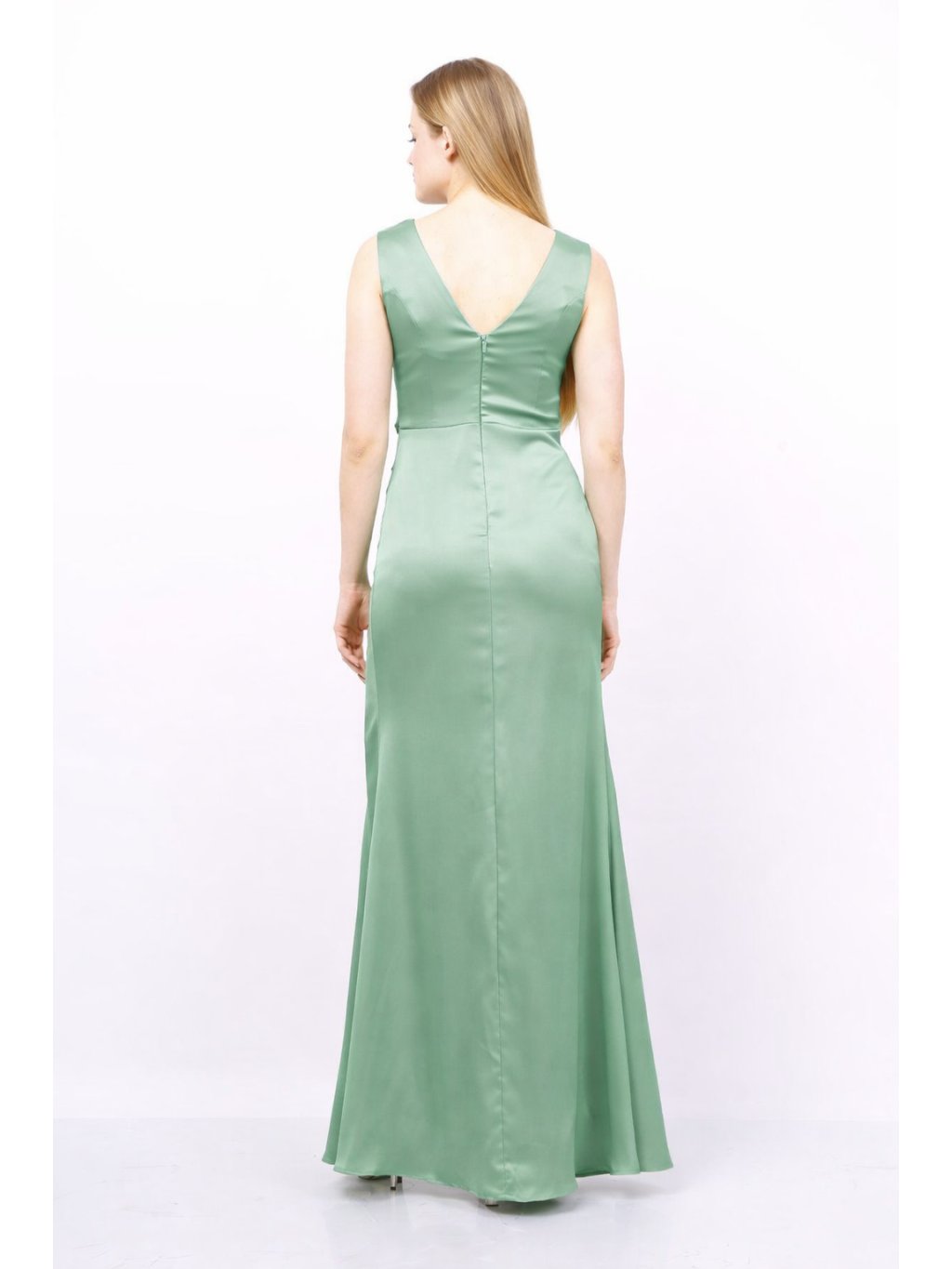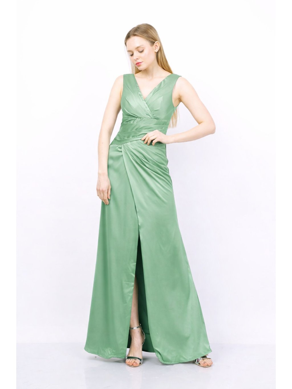 Živůtek s V výstřihem je doplněn jemným řasením v oblasti pasu, které opticky zeštíhluje siluetu. Sukně je dlouhá, splývavá a doplněná rozparkem, který dodává modelu lehkost a eleganci při chůzi. Zadní díl má V výstřih a zapínání na skrytý zip, díky čemuž šaty krásně sedí a snadno se oblékají.