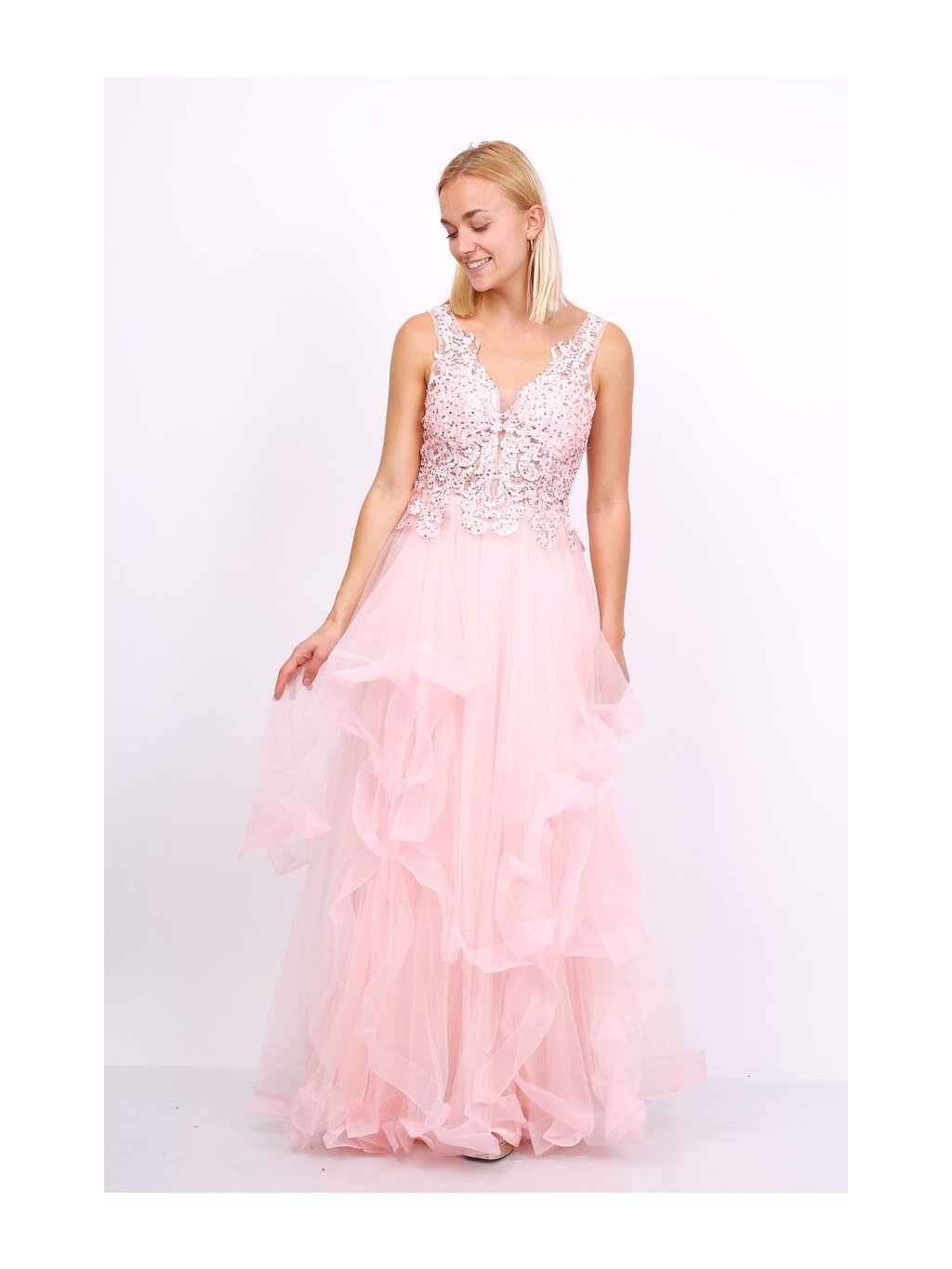 Tyto dlouhé společenské šaty v jemném pudrově růžovém odstínu jsou ztělesněním romantiky a elegance. Bohatě zdobený krajkový živůtek s jemnými aplikacemi krásně zvýrazňuje horní část postavy a dodává šatům slavnostní charakter. Výstřih do „V“ působí ženským dojmem, zatímco širší ramínka zajišťují pohodlné nošení a dobrou oporu.