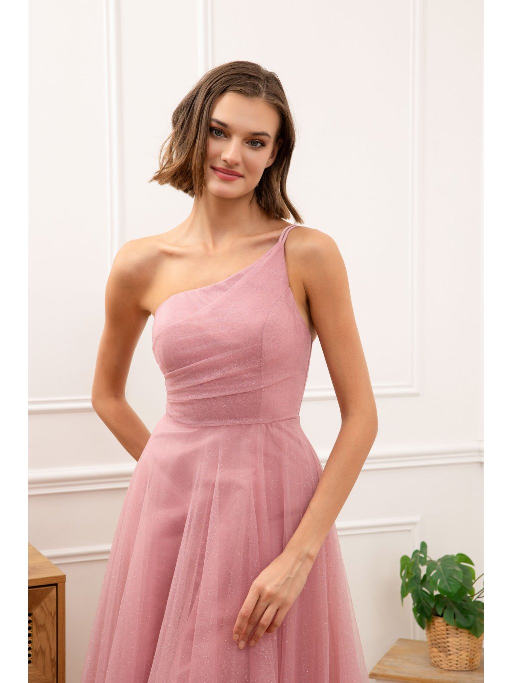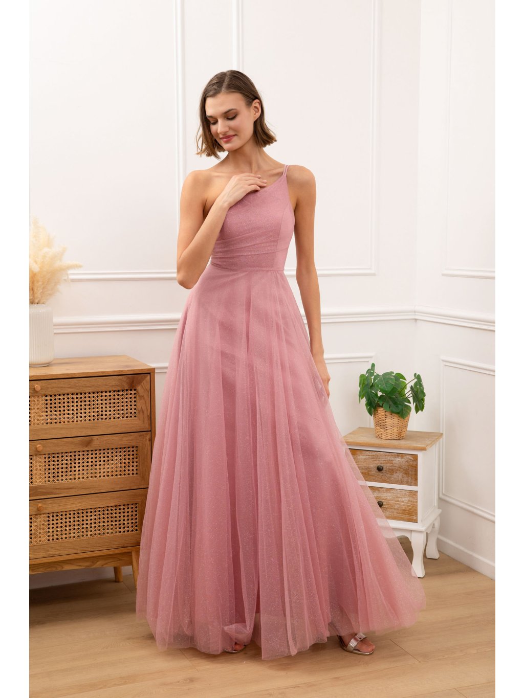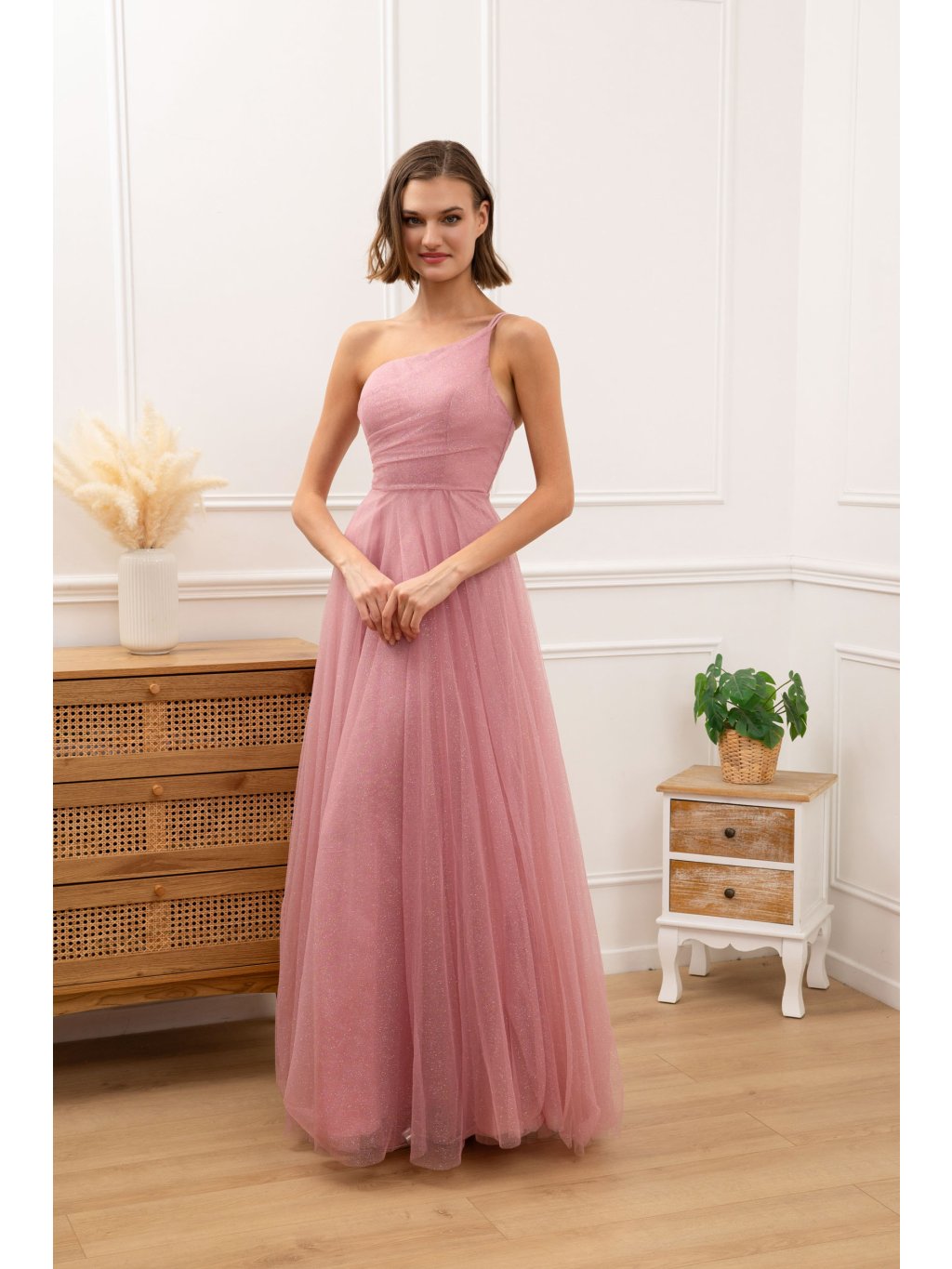 Elegantní dlouhé společenské šaty v jemném růžovém odstínu, které na první pohled zaujmou svou lehkostí a ženským provedením. Asymetrický střih na jedno rameno působí moderně a zároveň velmi sofistikovaně, krásně zvýrazňuje ramena i linii krku.