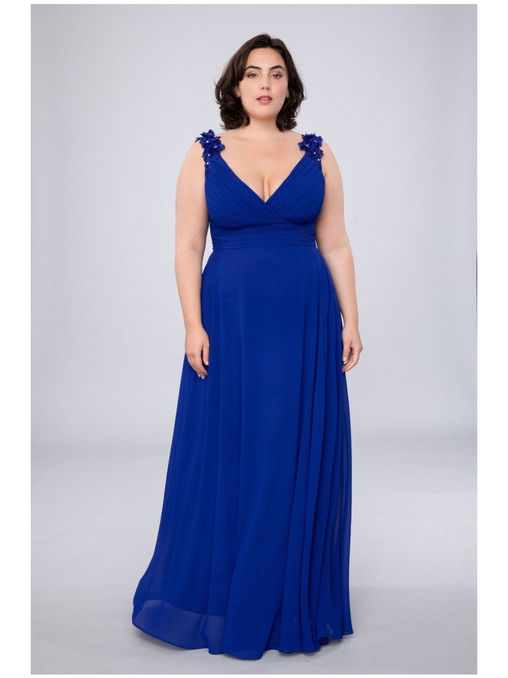 Dlouhé společenské šaty v královsky modré s květinovou aplikací na ramínkách