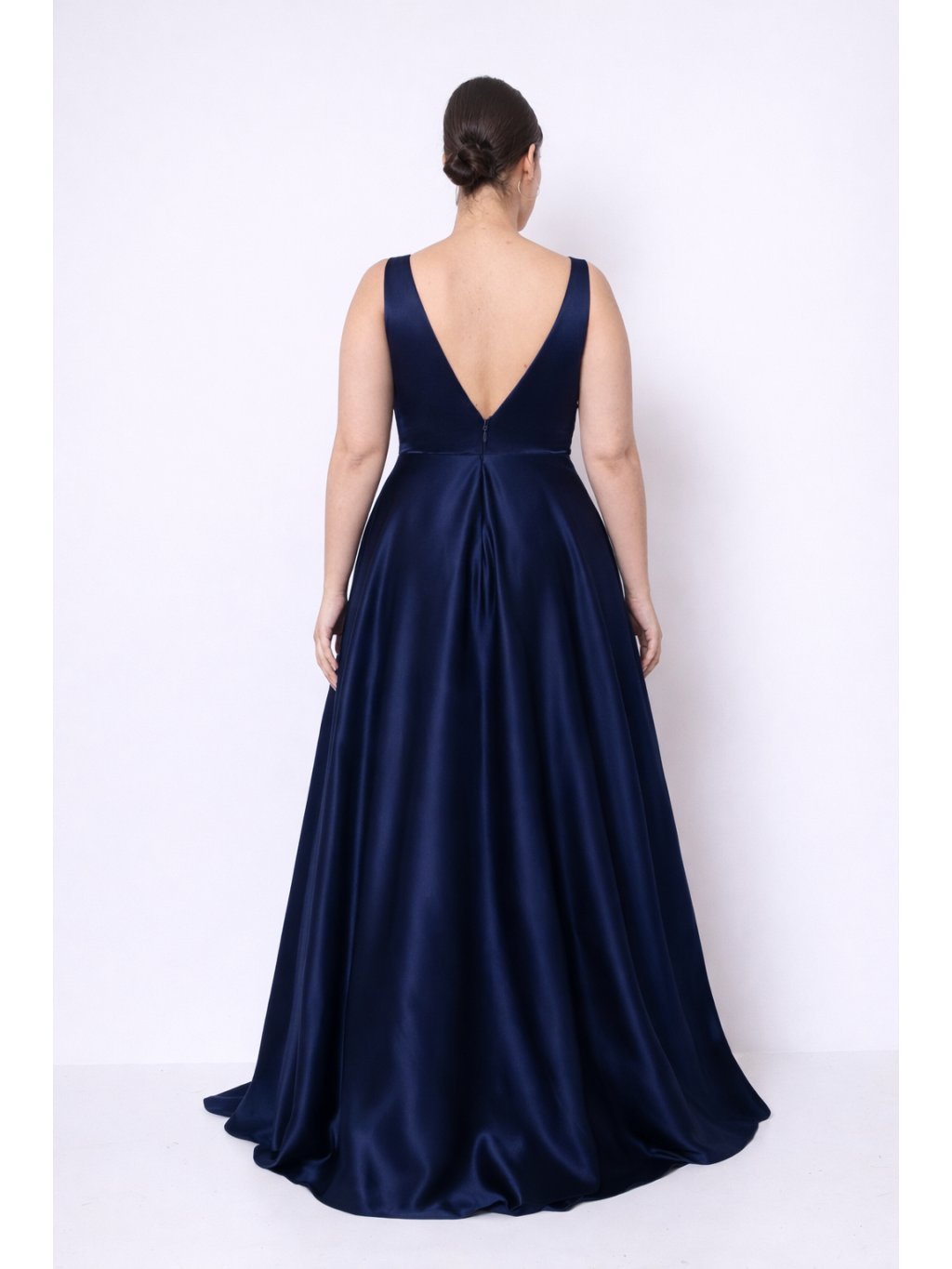 Dlouhé saténové společenské šaty s hlubokým výstřihem – tmavě námořnická modř