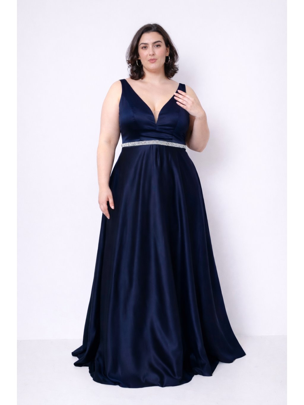 Elegantní dlouhé šaty v luxusní tmavě námořnické modři, které působí slavnostně, zeštíhlují siluetu a zároveň poskytují maximální pohodlí. Jemně lesklý saténový materiál krásně splývá a dodává šatům noblesní vzhled vhodný i pro ty nejvýjimečnější příležitosti.