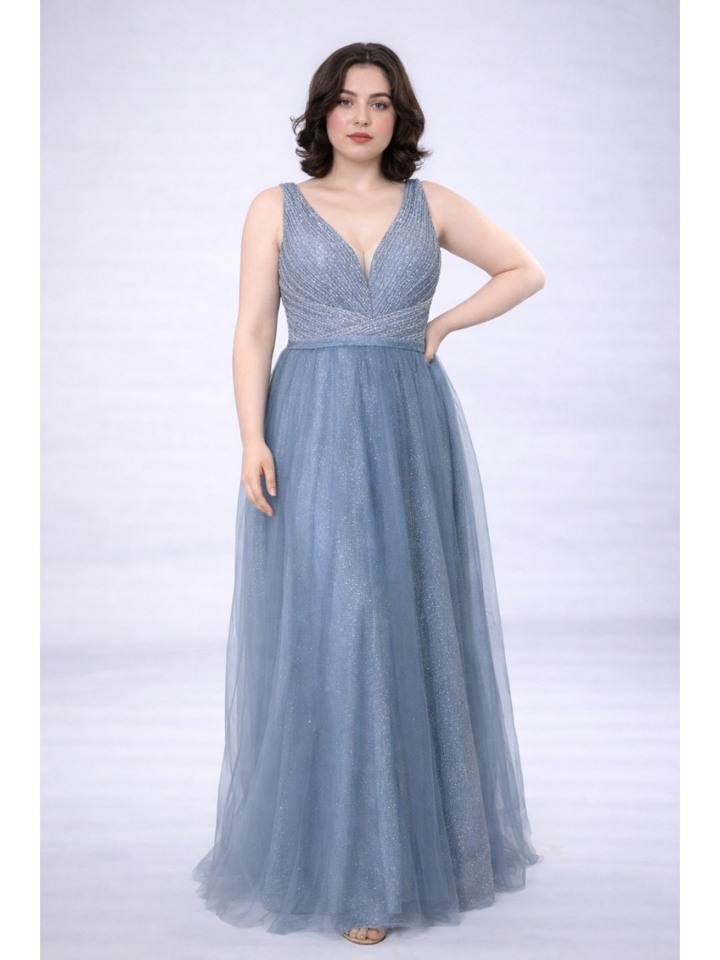 Dlouhé společenské šaty v jemném modrém odstínu se třpytivým živůtkem