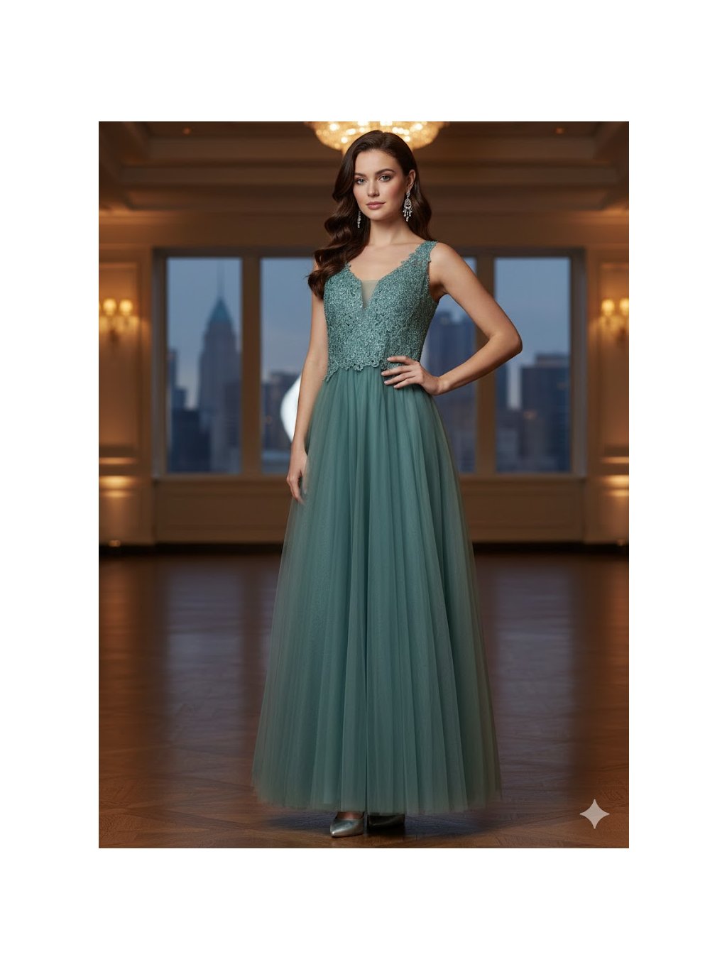 Tyto krásné šaty jsou výrazem elegance. Skládají se z dlouhé sukni ze šifonového materiálu, který dodává lehkost a pohyb šatů. Vrchu je výroben z kvalitní krajky zdobené kamínky, které dodávají šatům zářivý a luxusní vzhled.