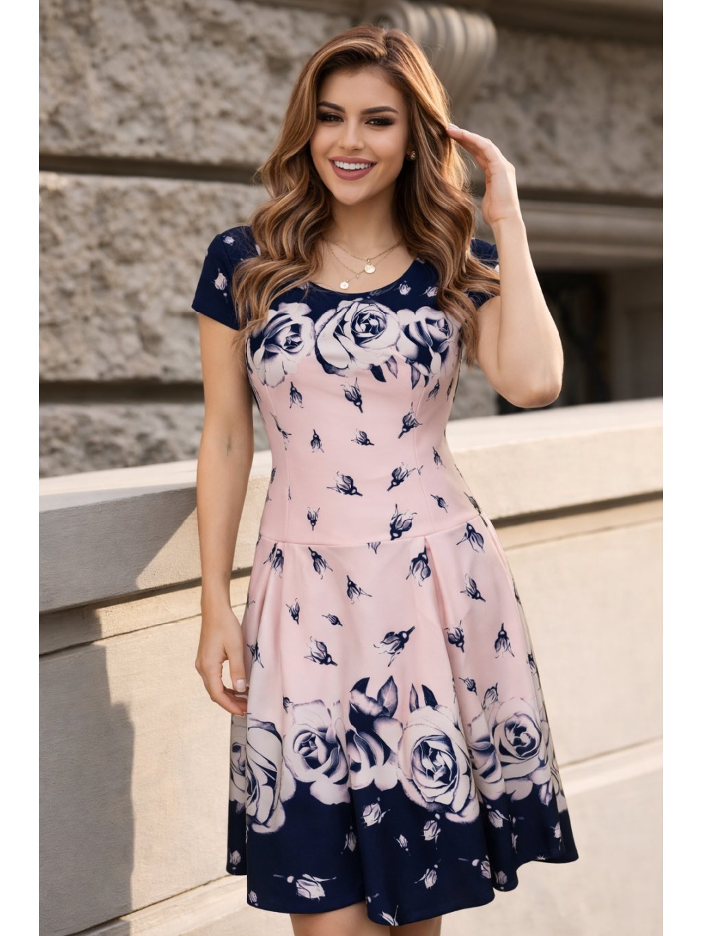 Elegantní dámské šaty, které na první pohled zaujmou jemným, ale zároveň výrazným květinovým motivem. Kombinace pudrově růžové a tmavě modré působí velmi žensky a nadčasově, díky čemuž se šaty hodí jak pro slavnostnější příležitosti, tak i pro běžné nošení.