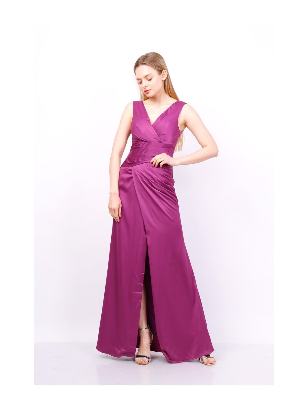 Živůtek s V výstřihem je doplněn jemným řasením v oblasti pasu, které opticky zeštíhluje siluetu. Sukně je dlouhá, splývavá a doplněná rozparkem, který dodává modelu lehkost a eleganci při chůzi. Zadní díl má V výstřih a zapínání na skrytý zip, díky čemuž šaty krásně sedí a snadno se oblékají.