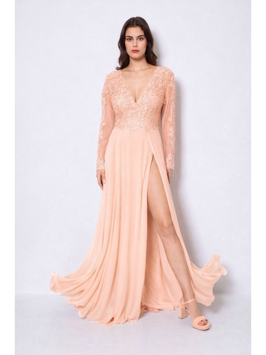 Okouzlující dlouhé společenské šaty ve světle broskvové barvě, které v sobě spojují ženskou eleganci a jemnou smyslnost. Bohatě zdobený krajkový živůtek s hlubším V výstřihem krásně tvaruje dekolt a působí velmi luxusním dojmem. Průhledné dlouhé rukávy dodávají modelu lehkost a noblesu.