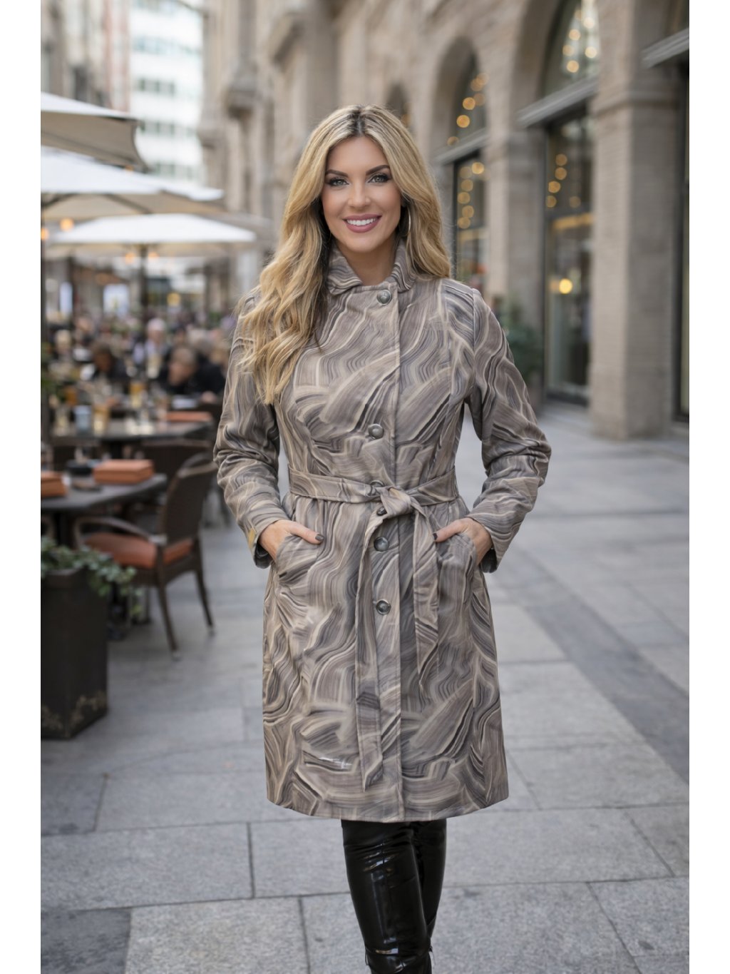 Kabát zaujme nejen svým atraktivním vzhledem, ale i promyšleným střihem. Díky pásku v pase si můžete jednoduše upravit siluetu přesně podle své postavy a zvýraznit ženské křivky. Praktické zapínání na knoflíky a pohodlné kapsy z něj dělají ideální kousek do města, do práce i na společenské příležitosti.