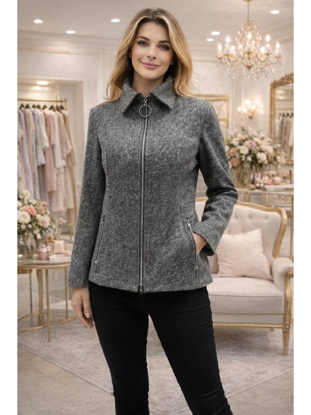 Elegantní dámská bunda v moderním střihu představuje ideální volbu pro ženy, které chtějí spojit styl, pohodlí a praktičnost v jednom kousku. Na první pohled zaujme jemně strukturovaným materiálem v nadčasovém šedém odstínu, který se snadno kombinuje s jakýmkoli outfitem – od ležérního po elegantní.