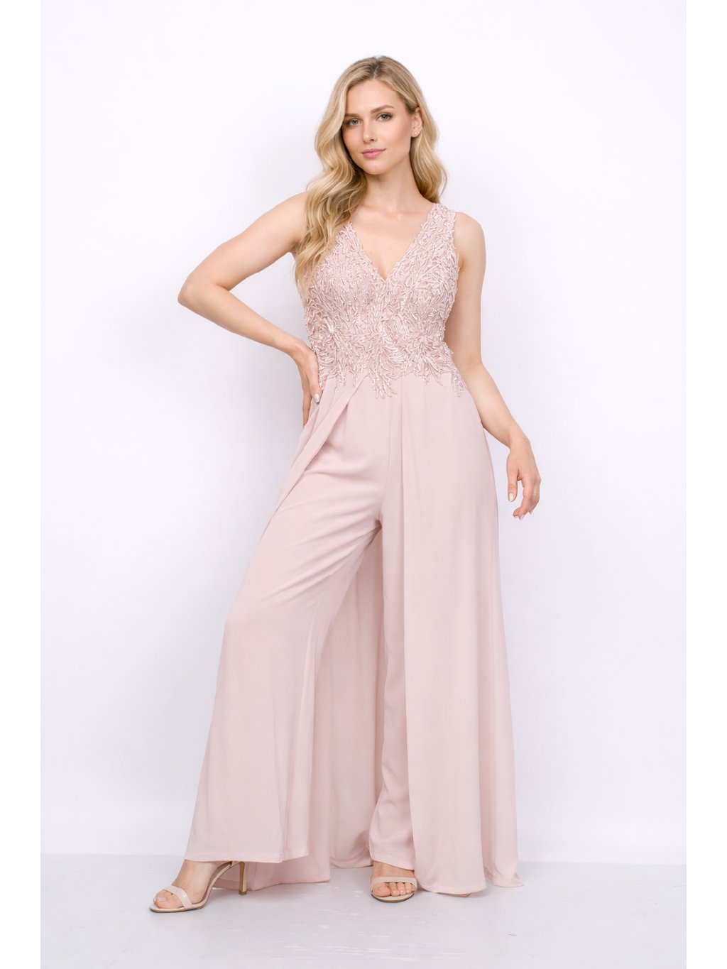 Elegantní společenský overal v jemném růžovém odstínu zaujme propracovaným krajkovým živůtkem s bohatou výšivkou a hlubokým V výstřihem. Splývavé široké nohavice dodávají modelu lehkost a slavnostní vzhled. Zadní díl s V výstřihem a zapínáním na skrytý zip krásně zvýrazní siluetu. Ideální volba na plesy, svatby i večerní společenské akce.